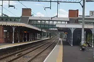 Witham railway station is on the Great Eastern Main Line (GEML) in the East of England, serving the town of Witham, Essex. It is about half a mile (1 km) to the north of the town centre and is 38 miles 48 chains (62.1 km) down the line from London Liverpool Street. On the GEML Witham is situated between Hatfield Peverel to the west and Kelvedon to the east.[1] It is the junction for the Braintree Branch Line to the east which opened in 1848, and between 1848 and 1964 it was also the junction for a west-facing branch line to Maldon. Its three-letter station code is WTM.