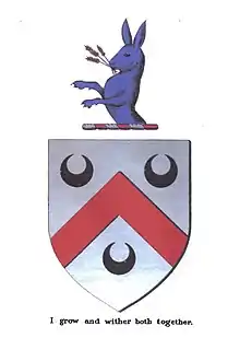 One Withers was granted a coat of arms. In the reign of Queen Mary I (1553–1558), Sir Richard Withers of East Sheen (ancestor of the poet George Wither) received a coat registered in the College of Arms, London.[2] The blazon has "Argent, a chevron gules between three crescents sable" (i.e., White/silver field, red chevron between 3 black crescents).[3] The traditional family motto is "I grow and wither both together".