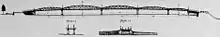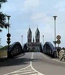 The bridge was built in 1885-86 in place of an inaccessible crossing of the same height by the Grand Duchy of Baden State Railway. It was designed by Max Meckel[2] who had designed the Herz-Jesu church shortly before, located in the axis of the bridge. The construction was carried out by the Eisenwerk in Kaiserslautern, an industrial company that was active in iron and steel construction. The bridge was inaugurated as "Kaiser-Wilhelm-Brücke",[3] however, the name didn't stick among the residents, who called it "Stühlingerbrücke". It crosses the station tracks and access roads on five -due to the railway tracks- uneven---. The cost of the Eisenwerk was of 151,412 German gold mark; the cost of the entire construction around 428,000 gold marks.