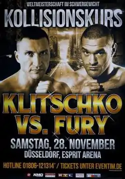 Wladimir Klitschko vs. Tyson Fury, billed as Kollisionskurs (German for Collision Course), was a professional boxing match contested for the WBA (Unified), WBO, IBF, IBO, and The Ring heavyweight titles. The fight took place on November 28, 2015 at Esprit Arena, Düsseldorf, Nordrhein-Westfalen, Germany. Fury was declared the winner by unanimous decision.[1] This ended Klitschko's reign of nearly 10 years, the second longest in heavyweight history.[2] Klitschko was entitled to a rematch per the fight contract.[3][4] Despite this, Fury was stripped of the IBF heavyweight title for agreeing to the rematch instead of facing the IBF mandatory challenger, Vyacheslav Glazkov.