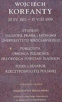Wojciech Korfanty (IPA: [ˈvɔjt͡ɕɛx kɔrˈfantɨ]; born Adalbert Korfanty; 20 April 1873 – 17 August 1939) was a Polish activist, journalist and politician, who served as a member of the German parliaments, the Reichstag and the Prussian Landtag, and later, in the Polish Sejm. Briefly, he also was a paramilitary leader, known for organizing the Polish Silesian Uprisings in Upper Silesia, which after World War I was contested by Germany and Poland. Korfanty fought to protect Poles from discrimination and the policies of Germanisation in Upper Silesia before the war and sought to join Silesia to Poland after Poland regained its independence.