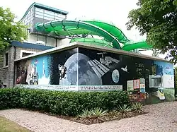 The Leisure Centre opened in 1976[2] and is accessed via a pedestrian bridge over a small river. It has a number of sports facilities, including 6 squash courts, a new state-of the art gym overlooking the park gym, three fitness studios, a dedicated Spinning (indoor cycling) studio and two halls.[2] The main sports hall is used for badminton, football, basketball, trampolining, sporting events and also a number of non-sports related activities, including antiques fairs, flea markets, and the annual Woking Beer Festival.[2] The second, smaller, hall is called the Wurlitzer hall and houses an American Theatre organ which offers regular concerts through The London and South of England American Theatre Society.[2] There is also a kids' indoor softplay area, called the Pick'n'mix Playstore, creche, cafe, Heatwaves suite featuring sauna, Jacuzzi and steam room. Sensations Multi-Sensory Suite.[2] Many clubs and groups use the centre including weightlifting, gymnastics, martial arts, and dance and drama and the facilities are available for club/group/business hire.