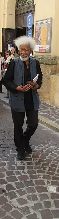 Akinwande Oluwole Babatunde Soyinka (Yoruba: Akínwándé Olúwọlé Babátúndé Ṣóyíinká; born 13 July 1934), known as Wole Soyinka (pronounced [wɔlé ʃójĩnká]), is a Nigerian playwright, novelist, poet, and essayist in the English language. He was awarded the 1986 Nobel Prize in Literature,[2] the first sub-Saharan African to be honoured in that category.[3][lower-alpha 1] Soyinka was born into a Yoruba family in Abeokuta.[4] In 1954, he attended Government College in Ibadan,[5] and subsequently University College Ibadan and the University of Leeds in England.[6] After studying in Nigeria and the UK, he worked with the Royal Court Theatre in London. He went on to write plays that were produced in both countries, in theatres and on radio. He took an active role in Nigeria's political history and her campaign for independence from British colonial rule. In 1965, he seized the Western Nigeria Broadcasting Service studio and broadcast a demand for the cancellation of the Western Nigeria Regional Elections.[7][8] In 1967, during the Nigerian Civil War, he was arrested by the federal government of General Yakubu Gowon and put in solitary confinement for two years.[9]
