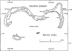 Woleai, also known as Oleai,[1] is a coral atoll of twenty-two islands in the eastern Caroline Islands in the Pacific Ocean, and forms a legislative district in the Yap State in the Federated States of Micronesia and is located approximately 57 kilometres (35 mi; 31 nmi) west-northwest of Ifalik and 108 kilometres (67 mi; 58 nmi) northeast of Eauripik. Woleai is also the name of the largest of the islets constituting the atoll, lying to the northeast.