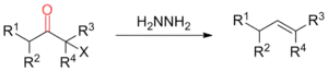 Kishner noted during his initial investigations that in some instances, α-substitution of a carbonyl group can lead to elimination affording unsaturated hydrocarbons under typical reaction conditions. Leonard later further developed this reaction and investigated the influence of different α-substituents on the reaction outcome.[20][31] He found that the amount of elimination increases with increasing steric bulk of the leaving group. Furthermore, α-dialkylamino-substituted ketones generally gave a mixture of reduction and elimination product whereas less basic leaving groups resulted in exclusive formation of the alkene product.