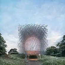 The Hive is a 17 metre[6] aluminium lattice cuboid that highlights the decline of the honey bee. By measuring the activity of a living bee colony at Kew Gardens, accelerometers feed live signals to 1000 LED lights which line the interior of the sculpture. The energy informs an ever-changing and fluid soundscape created by a selected ensemble of musicians who now write and perform under the name of BE.