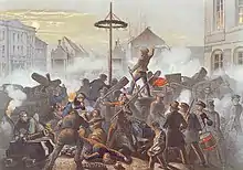 In the March Revolution of 1848, Straßmann fought on the barricades at Berlin's Königstrasse. On 18 March 1848 Prussian troops under the command of Karl von Prittwitz stormed the barricades, Straßmann and eight of his comrades managed to hide in the house of Meno Burg. Straßmann fled to the upper floor and was hidden in the bed of a servant girl while his comrades were executed by Prussian troops.[1][2] On 12 August 1848, Straßmann walked along the Unter den Linden in a group of revolutionaries which started to wrest Prussian cockades from other promenaders. At the Café Kranzler, he finally addressed the crowd, declared the Hohenzollern dynasty "no longer worthy of the throne of Prussia" and proclaimed the German Republic. He was arrested the same day, sentenced to six weeks imprisonment and banished from Berlin.[1][2]
