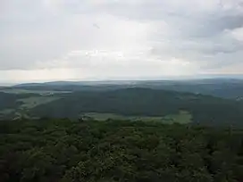 ![]() View from the observation tower to the Wolsküppel (center) in the Eastern Hintertaunus - with the village of Riedelbach (left). | |