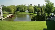 The college owns grounds on both sides of the river, including two meadows on the opposite side, towards Marston. It has a small but well maintained garden with mature trees behind its main building, and beside the river. The garden is landscaped well on the river-bank, with a flight of steps leading up to a green-house and a sundial. The college also has a smaller garden beside the Robin Gandy building, which stands on the banks of the river.