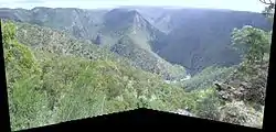 In the Oxley Wild Rivers National Park approximately 40 kilometres (25 mi) due east of Armidale and 1.45 kilometres (0.90 mi) off the Waterfall Way,[4] the Wollomombi Falls are atop the Wollomombi Gorge near the confluence of the Wollomombi River with the Chandler River. The Chandler Falls are on the Chandler River, adjacent to the Wollomombi Falls. The falls descend from an elevation of 907 metres (2,976 ft) above sea level (AHD) in one drop of 100 metres (330 ft),[3] with a total descent that ranges in height between 150–230 metres (490–750 ft) depending on the flow of the river.[4]