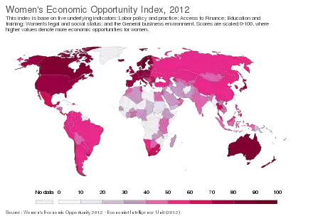 The Women's Economic Opportunity Index is an index compiled by the Economist Intelligence Unit that measures the enabling environment for women's economic participation in 128 countries. The Economist Intelligence Unit's Women's Economic Opportunity Index is based on 29 indicators that measure a country's laws, regulations, practices, customs and attitudes that allow women to participate in the workforce under conditions roughly equal to those of men, whether as wage-earning employees or as owners of a business.[2] The index was first produced in 2010, with an updated index produced in 2012. Three indicators were added and 15 new countries were assessed in the 2012 version of the Index.