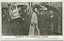 Elizabeth Wilks who was the treasurer of the league refused to pay her tax in 1908.[4] Actually married women were not required to pay tax in Britain at that time. According to the law the joint income of a couple was added together and the husband paid the tax. However Elizabeth who earned more than her husband refused to tell her husband how much she earned. This put the authorities into a quandary as Elizabeth was not liable to pay tax and her husband said he was willing to pay the tax but he said that he had no idea how much to pay.[5] In 1910 the authorities illegally seized some of Elizabeth's goods in an attempt to levy the tax on her income. The authorities then tried to claim the tax either from the Wilks or by her husband alone. This was legally unsatisfactory as Mark was being asked for tax on an income of about £600 per annum that he was nominally unaware of. Then 3,000 teachers signed a petition when Mark Wilks was placed in Brixton prison and there was a demonstration in Trafalgar Square to protest at his treatment. He was released after a fortnight to a celebrations from the supporters of the Women's Tax Resistance League[6] which included George Bernard Shaw.[4]