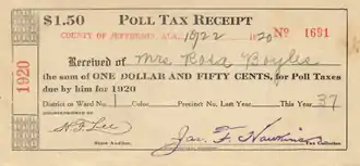 The motivations of women in the movement differed. Some came to the anti-tax movement from former work with women's suffrage, some from labor union activism aimed at improving working conditions for women, and others from the early civil rights movement.[59] Unlike the single-focus on women's rights by elite white middle- and upper-class activists of earlier women's organizations, activists involved in the movement to repeal poll taxes acknowledged the racial component of the struggle.[60] According to the historian Rachel Gunter, activists "strategically deployed (and refrained from deploying) racial arguments when it best suited their cause".[61] White women used white men's negrophobia in their arguments for why poll taxes should be abolished.[62][63] Their reasoning was that if white women could vote then white voters would outnumber black,[62] securing white political power. Activists stressed that if the majority white voters did decline because of poll tax repeal, white supremacy would still be protected by other disenfranchising policies, especially literacy tests[63][Notes 5] and white primaries.[Notes 6] This was shown to be the case in states which abolished the tax.[63][73] In some cases, cross-racial groups found that building a support base for legal change required black women in the South to work in the background, allowing white women to lead, so that their agenda was not threatening to white males.[74]