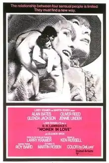 Women in Love is a 1969 British romantic drama film directed by Ken Russell and starring Alan Bates, Oliver Reed, Glenda Jackson, and Jennie Linden. The film was adapted by Larry Kramer from D. H. Lawrence's 1920 novel Women in Love.[2] It is the first film to be released by Brandywine Productions.[3]