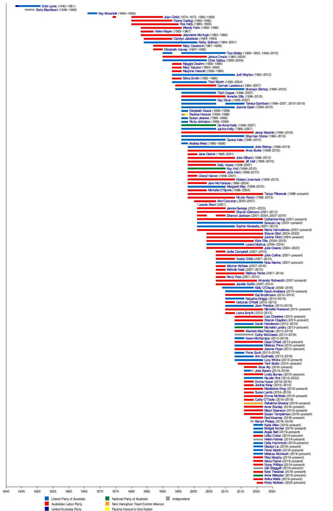 | 1 | Dame Enid Lyons | UAP; Liberal | Darwin (Tas.) | 21 August 1943 – 19 March 1951 (retired) |