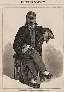 Wong Chin Foo (Chinese: 王淸福; pinyin: Wáng Qīngfú; 1847–1898) was a Chinese-American activist, journalist, lecturer, and one of the most prolific Chinese writers in the San Francisco press of the 19th century. Wong, born in Jimo, Shandong Province, China, was among the first Chinese immigrants to be naturalized in 1873. Wong was dedicated to fighting for the equal rights of Chinese-Americans at the time of the Chinese Exclusion Act.[1][2] Nowadays, Chinese-Americans consider Wong to be of similar character as Dr. Martin Luther King or Gandhi because of Wong's tremendous efforts and huge sacrifices to defend Chinese-Americans' rights in that difficult time.[3]