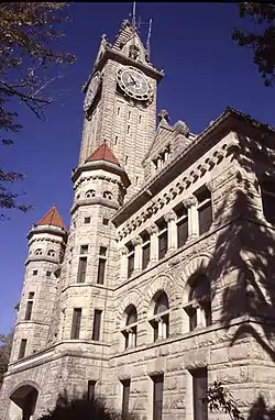 The Wood County Courthouse and Jail, located in Bowling Green, Ohio, United States, is Wood County's third courthouse. It was built after citizens decided to move the county seat from Perrysburg to Bowling Green. Ground was broken on November 28, 1893, and the cornerstone was laid on July 4, 1894. The architectural firm of Yost & Packard of Columbus designed the courthouse and construction was overseen by T.B. Townsend of Youngstown. The winning tender for the project was $153,803 and the final construction costs totaled $255,746.