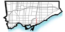 ![]() Woodbine Avenue within Toronto, Red: Woodbine Avenue, Pink: Woodbine Heights Drive | |||
