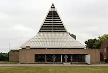 Holy Cross Church is the Church of England church, dating from the 12th century.[10] The distinctive Roman Catholic St. Michael and All Angels church was designed by the F. X. Velarde Partnership.[11] This church was commissioned in 1962 and opened in 1965, to serve the parish which had been founded in 1952.[5][12][13] Woodchurch Methodist Chapel was built in 1963.[5]