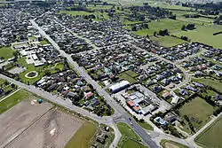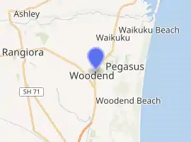 Woodend is a town in the Waimakariri District, in the Canterbury Region of the South Island of New Zealand. It may have been named because it was on the edge of what was then called the Maori Bush, or after an early settler, Thomas Wooding.[3] It is situated with both the Waimakariri and Ashley / Rakahuri Rivers running either side. Woodend is 6.6 kilometres north of Kaiapoi and 6.3 kilometres to the east of Rangiora. Woodend is within walking distance of the town of Pegasus.