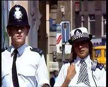"Woodentop" has an unusual place in the history of The Bill due to the original premise of this being a one-off play. After broadcast, Thames commissioned a full series to be shown the following year, under the name The Bill as the show had the potential to appeal to a mass audience. Although The Bill is clearly a continuation from this episode, the main series contradicts it in a number of ways. For instance, in Woodentop Litten has completed his secondment to CID[4] and is close to securing his place in the detective branch, whereas in The Bill he does not gain his CID secondment until halfway through Series One. In addition many central characters in "Woodentop" - such as Sergeant Wilding and Inspector Deeping - vanish between the pilot and the series. Deeping does gain one mention in Series One, in the episode "It's Not Such a Bad Job After All", where Ackland is informed that he is coming to meet her on the scene of a suicide - a later radio transmission, however, reports that Sgt. Bob Cryer is to meet her instead. Although Wilding is not mentioned following Woodentop, he shares several characteristics with Sgt. Cryer - including a position as the "father figure" of the Sun Hill relief, and an apparently tumultuous relationship with Roy Galloway, whom both Cryer and Wilding refer to as a "bloody superstar". In the first episode of Series One, "Funny Ol' Business - Cops and Robbers", Galloway and Cryer make apparent reference to the events of Woodentop in regards to Jim Carver. Galloway suggests that it is Cryer who requested the favour, further suggesting that Cryer and Wilding are in fact the one character, and that, like PC Taffy Morgan (later Taffy Edwards), Jack Wilding's name has merely been changed to Bob Cryer. There are also discrepancies with the naming of some of the characters. In the 2003 live episode of The Bill, made to celebrate the twentieth anniversary of broadcast, Carver and Ackland discuss events from the pilot, whereupon Carver incorrectly refers to the character of Taffy by the surname Morgan, a name that was dropped for the series proper in favour of "Edwards".[5] There are also mistakes made in some of the uniforms the cast wore during the episode, for example, in one scene, PC Dave Litten is on foot patrol with PC Jim Carver, and PC Litten's helmet has GR on the helmet badge where it should have had ER, the same that was on PC Carver's helmet. Also the tunics the male officers wore had buttoned down epaulettes, whereas they should have just had the insignia placed on the shoulder of the tunic as this is what the Metropolitan Police wore at the time. Only four of the cast of "Woodentop" would go on to be regulars in the main series of The Bill: Mark Wingett, Trudie Goodwin, Gary Olsen and Colin Blumenau, while a number of characters were re-cast, including Roy Galloway.[6]