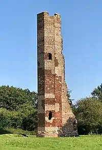 The Tower-on-the-Moor, an octagonal, four-storey, red brick-built tower, is the stair turret of what is believed to have been a hunting lodge, built in the mid–15th century for Ralph de Cromwell, 3rd Baron Cromwell whose fortified house, Tattershall Castle, was located 4 miles (6 km) to the south in Tattershall.[20] It is a Grade II* Listed Building[20] and a scheduled Ancient Monument.[21] Documentary sources indicate that the tower was partly dismantled in 1472, when bricks from the Tower on the Moor were used for repairs at Tattershall Castle.[22][23] One of the older roads in Woodhall Spa, Tor-O-Moor Road is named after the tower.