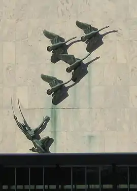 The Milwaukee Public Museum is one of the leading museums of human and natural history as well as the first museum to create full-sized dioramas. It originally shared a space with Milwaukee Public Library. In 1950 the architectural firm Eschweiler and Eschweiler proposed designs for a new building to house the museum. The building was built in the 1960s when Stephan Borhegyi, then museum director, led the effort to finish the project and incorporate advanced museum theories to the interior spaces. The building's architects commissioned Marshall Fredericks to create a sculpture for the museum's entrance facade. Woodland Indian and Whistling Swans symbolizes the Great Lakes area. "A Woodland Indian, ready to release an arrow from his bow, pauses in awe before the beauty of nature as seen in the flight of swans."[2] Although Fredericks was paid $50,000 for the artwork, the mounting of the work was problematic because of the sculpture's weight and size. The city had to negotiate with contractors before the sculpture was finally installed.