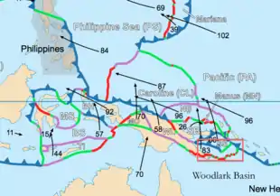 The Woodlark Basin originally began to open as a sphenochasm with a pole near the tip of eastern Papua about 20 million years ago. A sphenochasm is a triangular gap of oceanic crust separating two continental blocks and converging to a point. This was caused by left-lateral shear in the region induced by a change in the relative motion pole of the Indo-Australian plate and Pacific Plate. The basin opened only a few degrees at this time, then stopped for a period of time. Then the rifting resumed in the entire basin about 3 million years ago, based on magnetic anomaly data. Then about 1 million years ago, the spreading center in the western basin shifted to the Woodlark Rise.[1] The Woodlark Rise is the northern section of the Woodlark Basin that separates the basin from the bordering Soloman sea to the north.[4] This spreading rift marks the southern boundary of the Solomons Plate which is bounded by subduction zones in the north and east (the New Britain and northern Solomons Trenches, respectively) and in the west by a combination strike-slip rifting (dip-slip) boundary in eastern Papua (New Guinea). A vector triangle solution near the Solomons Trench-Woodlark Rift triple point gives underthrusting of the Solomons Plate beneath the northern Solomon Trench in a northeasterly direction at about 11 centimeters per year.[1] Figure 2 shows each of the tectonic plates surrounding the Woodlark Basin along with the relative plate motion and direction that each plate is moving.
