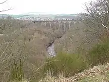 As built, the sandstone viaduct has a length of 229 metres and reaches a peak height of 49.2 metres at one point, though the average height of the structure is 28.8 metres.[3] Efforts were made to keep both the deck and the approaches relatively level; the northern approach has a 1 in 200 gradient, while the southern approach has a less gentle gradient of 1 in 150. It has 14 semi-circular ashlar arches, nine of them having a span of 15.24 metres and the remainder possessing a 9.1 metre span, these smaller arches being placed at the ends of the structure.[3] The thrust pressure line is close to the centre of each arch ring; the rings of the main arches have a thickness of 610mm (one twenty-fifth of the span), resulting in a calculated horizontal pressure present upon the arch's keystone of roughly 254 tonnes.[3]