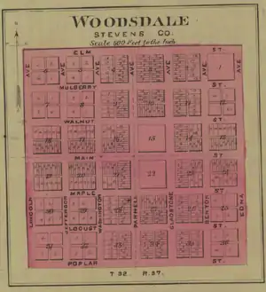 Woodsdale was laid out in 1886 near the geographical center of the county, with the hope of locating the county seat there.[2]