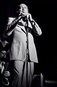 Herman continued to perform into the 1980s, after the death of his wife and with his health in decline, chiefly to pay back taxes that were owed because of his business manager's bookkeeping in the 1960s.[54] Herman owed the IRS millions of dollars and was in danger of eviction from his home.[6] With this added stress, Herman still kept performing. In a December 5, 1985, review of the band at the Blue Note jazz club for The New York Times, John S. Wilson pointed out: "In a one-hour set, Mr. Herman is able to show off his latest batch of young stars—the baritone saxophonist Mike Brignola, the bassist Bill Moring, the pianist Brad Williams, the trumpeter Ron Stout—and to remind listeners that one of his own basic charms is the dry humor with which he shouts the blues." Wilson also spoke about arrangements by Bill Holman and John Fedchock for special attention. Wilson spoke of the continuing influence of Duke Ellington on Woody Herman bands from the 1940s to the 1980s.[55] Before Woody Herman died in 1987 he delegated most of his duties to leader of the reed section, Frank Tiberi.[56] Tiberi leads the current version of the Woody Herman orchestra.[57] Tiberi said at the time of Herman's death that he would not change the band's repertoire or library.[58] Herman died on October 29, 1987,[59] and had a Catholic funeral on November 2 at St. Victor's in West Hollywood, California.[60] He is interred in a niche in the columbarium behind the Cathedral Mausoleum in the Hollywood Forever Cemetery.
