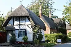 The oldest part of the Grade II* listed Manor House, southeast of the church, is a wing of a 15th-century house, built in limestone.[14] After alterations and extensions in the 16th and 18th centuries the house is mostly timber-framed under a thatched roof; nearby is a barn, late 18th century or early 19th, of similar construction.[15] Church Farmhouse, on the village street just north of the church, began as a timber-framed house in the 17th century and was rebuilt with a tile-hung upper storey.[16] Brimslade Farmhouse (16th century) is also Grade II* listed.[17]