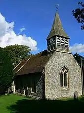 The Church of England parish church of St Andrew stands towards the south of the village, and is built in flint and sarsen with limestone dressings. The mid 14th century building was thoroughly restored in 1861 by G. E. Street, and was designated as Grade II* listed in 1964.[11]