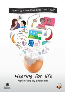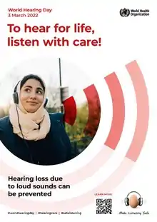 World Hearing Day is a campaign held each year by Office of Prevention of Blindness and Deafness of the World Health Organization (WHO). Activities take place across the globe and an event is hosted at the World Health Organization on March 3. The campaign's objectives are to share information and promote actions towards the prevention of hearing loss and improved hearing care. The first event was held in 2007.[1] Before 2016 it was known as International Ear Care Day.[2] Each year, the WHO selects a theme, develops educational materials, and makes these freely available in several languages. It also coordinates and reports on events around the globe.