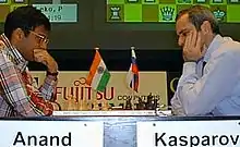 In the final, Anand defeated Karpov in Game 1 with White to take a 1-0 lead; Anand maneuvered his light-squared bishop to slowly gain an advantage throughout the game, before 54... a5? gave the Indian a winning advantage.[45] In Game 2, Karpov pressed but was unable to crack Anand's Semi-Slav Defence, leading to a 34-move draw.[46]