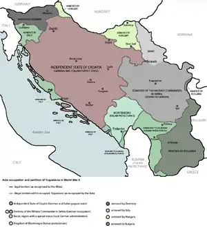 In April 1941, the Kingdom of Yugoslavia was invaded by the Axis powers. After Nazi forces entered Zagreb on 10 April 1941, Pavelić's closest associate Slavko Kvaternik, proclaimed the formation of the Independent State of Croatia (NDH) on a Radio Zagreb broadcast. Meanwhile, Pavelić and several hundred Ustaše volunteers left their camps in Italy and travelled to Zagreb, where Pavelić declared a new government on 16 April 1941.[60] He accorded himself the title of "Poglavnik" (German: Führer, English: Chief leader). The NDH combined most of modern Croatia, all of modern Bosnia and Herzegovina and parts of modern Serbia into an "Italian-German quasi-protectorate".[61] Serbs made up about 30% of the NDH population.[62] The NDH was never fully sovereign, but it was a puppet state that enjoyed the greatest autonomy than any other regime in German-occupied Europe.[59] The Independent State of Croatia was declared to be on Croatian "ethnic and historical territory".[63]