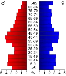 The age distribution was 24.30% under the age of 18, 6.50% from 18 to 24, 26.30% from 25 to 44, 23.50% from 45 to 64, and 19.40% 65 or older. The median age was 41 years. For every 100 females, there were 98.50 males. For every 100 females age 18 and over, there were 95.20 males.