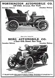 In 1904 Horseless Age Magazine reported that the leaders of the Worthington Automobile Company, had purchased the rights and property of the Berg Automobile Company. The Berg company would retain its name. The Worthington company would sell the 18-horsepower Berg under the name of the Meteor. A new garage was being built between West 49th and 50th streets. Charles C. Worthington was president of the company and H. Rossiter Worthington was secretary and treasurer.[4] In August 1904 the Worthington Automobile Company entered their Meteor and Berg cars in the Long Branch, New Jersey, automobile races, and in the five-mile pick up race finished first and second.[5]