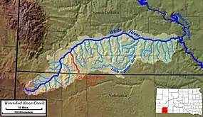 The creek rises in the southwestern corner of the Pine Ridge Indian Reservation, along the state line with Nebraska, and flows northwest. It borders the site of the 1890 Wounded Knee Massacre, in which the 7th US Cavalry under Colonel James W. Forsyth massacred approximately 300 Sioux, mostly women and children, many unarmed.[3][4] Towns in this region include Wounded Knee and Manderson. The Wounded Knee Creek flows NNW across the reservation and joins the White south of Badlands National Park.