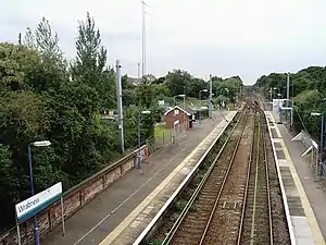Platform 1 (London bound) and platform 2 (Harwich bound) have an operational length for four-coach trains.[1] There were formerly sidings at the west (London) end of both the "up" and "down" lines. Those on the up side were used for local goods work, coal being one of the commodities handled. The sidings on the down side were extended during World War II to the riverside to accommodate a large rail-mounted gun which was intended to protect the estuary.[2]