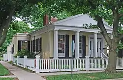 The Wright~Brooks House is a single-story brick Greek Revival house with a gable roof. It sits on a sandstone foundation, and a clapboard addition is constructed at the rear. The house has a notable front entrance portico, supported by four delicate Doric columns and containing an elaborate entrance with architrave trim, sidelights, and a transom. The entrance is flanked by high porch windows, which extend almost to the floor. [2]