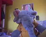 The dogs were made in three sizes. Most common are the medium-sized toys, which are about 18 inches (46 cm) high, and are the most anthropomorphic, as they were designed to sit upright. They are dressed in jogging suits, in overalls and a T-shirt, or in dresses, and have openings to allow them to double as hand puppets.[1] There are also smaller, nine-inch-high (23 cm) toys, who sit on four legs and wear bonnets and booties, and larger toys, which are over 2 feet (61 cm) tall. Other Wrinkles animals were also manufactured, including a moose named Moogums (or Moogy), and an elephant named Trunkit.