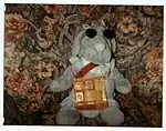 As proof of authenticity, all Wrinkles toys have a bone-shaped symbol embroidered into their ear. As well, they all came with a fabric bone. The plush Wrinkles spawned some additional merchandise, including metal dinner trays,[2] PVC figures, poseable dolls and even a direct to video movie featuring child actress Amy Foster.[3]