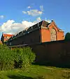 Wronki Prison, three four-story buildings in a cross formation, was designed to accommodate 750–800 prisoners, accompanied by buildings housing the guards and other auxiliary personnel. It was built in 1889 by the Prussian government of Germany and brought into use in 1894 as the Zentralgefängnis für die Provinz Posen.[4][5][6] It was modeled on contemporary American prisons (the Philadelphia System).[4][6] Prisoners were employed in production of stockings and in other tasks.[4][6]