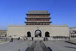 In ancient times, Wuwei was called Liangzhou (涼州—the name retained by today's Wuwei's central urban district) and is the eastern terminus of the Hexi Corridor. People began settling here about 5,000 years ago. It was a key link for the Northern Silk Road,[1] and a number of important archaeological finds were uncovered from Wuwei, including ancient copper carts with stone animals.[2] The motifs and types of objects in the Wuwei graves, as well as their earthenware, lacquer, and bronze composition, constitute typical examples of the Han Chinese burial style that can be found all over China. Other graves found along the Hexi Corridor show Xiongnu and other minority influence, which are used to trace regimes such as the Northern Liang.[3] It became an important provincial capital during the Former Han Dynasty as the Hou Hanshu makes clear: