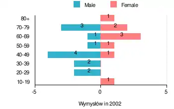 According to the 2002 Poland census, there were 22 people residing in Wymysłów village, of whom 59.1% were male and 40.9% were female. In the village, the population was spread out, with 4.5% under the age of 18, 31.8% from 18 to 44, 18.2% from 45 to 64, and 45.5% who were 65 years of age or older.[1]