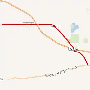 Wyoming Highway 12 travels from Wyoming Highway 130, five miles (8 km) west of Laramie near the Laramie Regional Airport west to an intersection with Albany County Route 57 (Mandel Lane) just past the junction with Interstate 80 (Exit 297). From there WYO 12 becomes Albany County Route 57 (Dutton Creek Road). Further west, CR 57 connects with I-80 again at Exit 290[2] (Quealy Dome) by the way of Albany CR 59 (Hunt Road), and at Exit 279 at the end of Dutton Creek Road. Mileposts along Highway 12 increase from east to west.[1][3]