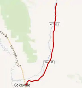 WYO 232, locally named Smith Forks Road,[1] travels from an intersection with US Route 30/Wyoming Highway 89 and Wyoming Highway 231 in Cokeville northeast to the Button Flat. WYO 232 heads north toward the Commissary Ridge of the Bridger-Teton National Forest. The Cokeville city limits are at Milepost 0.09, and Highway 232 ends at Milepost 12.22 with local roadways near the National Forest.[1]
