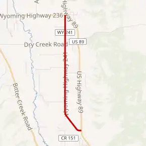 Wyoming Highway 241 begins its southern end at US Route 89 in Smoot and from there parallels US 89 which lies east of Highway 241. WYO 241 heads north 4.27 miles and ends at Wyoming Highway 236 near its east end with US 89; located just south of Afton.[2]