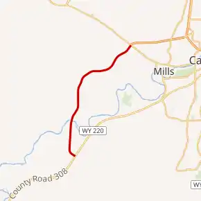WYO 257 begins southwest of Red Butte at a junction with WYO 220, a divided highway that connects Alcova to Casper.[2] The highway travels north across the North Platte River and begins ascending a plateau, gaining a northbound truck climbing lane in the process. After passing a historic marker commemorating the Oregon Trail,[3] WYO 257 turns northeast towards the outskirts of Mills and passes a small housing subdivision in the process. The highway then intersects Robertson Road and enters an industrial area before it terminates at an intersection with US 20 and US 26. The road continues east onto the Shoshoni Bypass, an expressway carrying US 20 and US 26 to an interchange with I-25.[2][4]